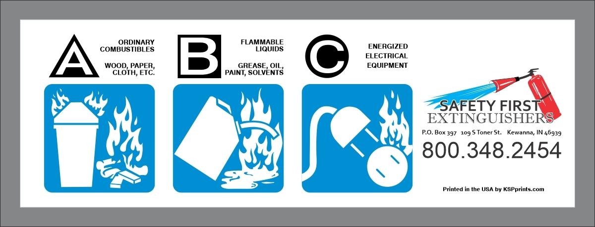 What happens when there is a fire? Does your customer know which one of your extinguishers to use? Extinguisher class labels make it clear which one to use for different types of fires. Namely this extinguisher can extinguish this type of fire but not another. These customized extinguisher classification labels can be placed right on your extinguisher, so your customer can quickly tell which extinguisher to use. Your contact information located on the fire classification sticker subsequently lets them know who to call after extinguisher is used or if there is a question. Don’t forget to help them find the extinguisher in the first place.