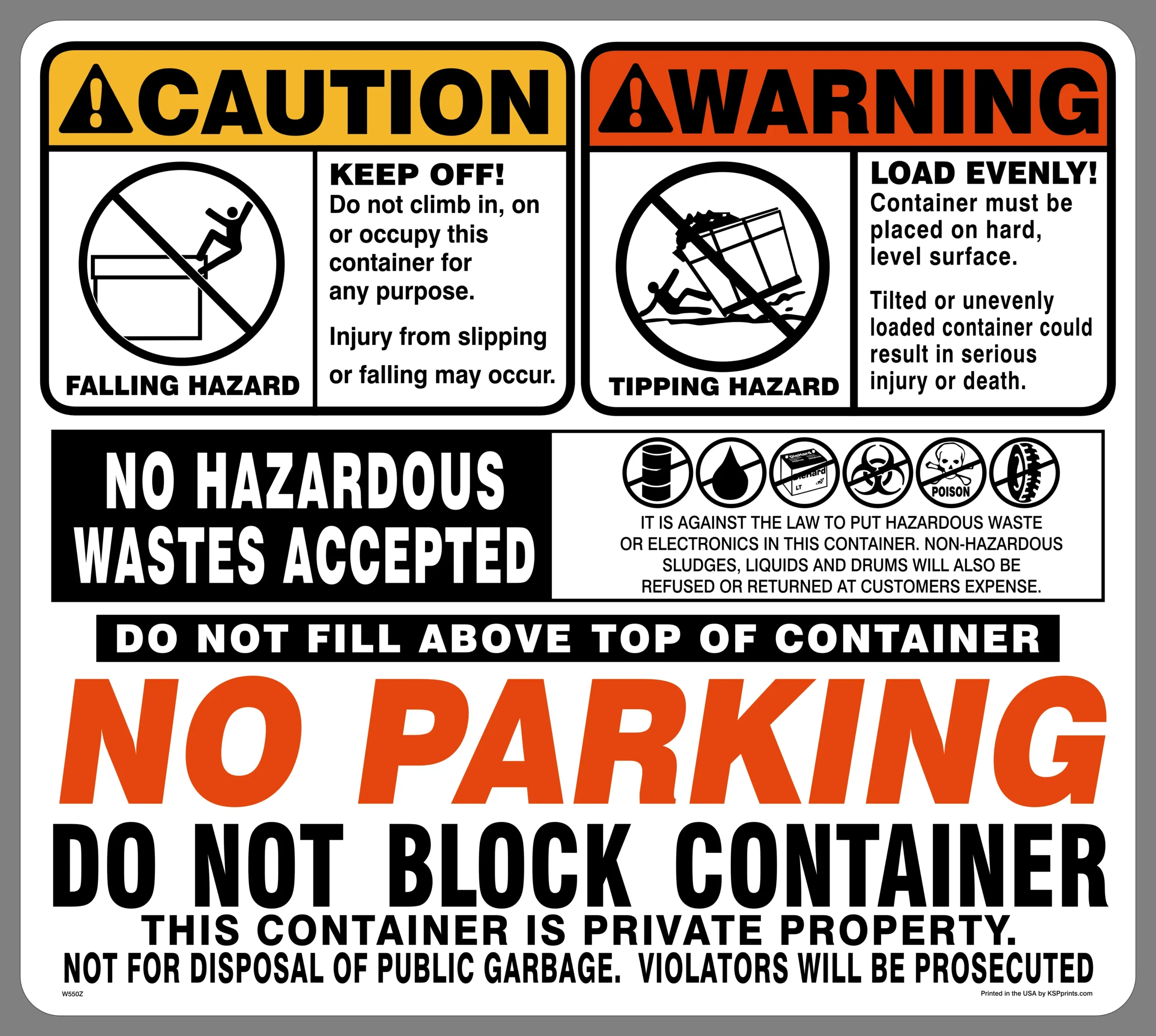 - TEXT: CAUTION FALLING HAZARD: KEEP OFF! DO NOT CLIMB IN, ON OR OCCUPY THIS CONTAINER FOR ANY PURPOSE. INJURY FROM SLIPPING OR FALLING MAY OCCUR. WARNING TIPPING HAZARD: LOAD EVENLY! CONTAINER MUST BE PLACED ON HARD, LEVEL SURFACE. TILTED OR UNEVENLY LOADED CONTAINER COULD RESULT IN SERIOUS INJURY OR DEATH. NO HAZARDOUS WASTES ACCEPTED: IT IS AGAINST THE LAW TO PUT HAZARDOUS WASTE OR ELECTRONICS IN THIS CONTAINER. NON-HAZARDOUS SLUDGES, LIQUIDS AND DRUMS WIL ALSO BE REFUSED OR RETURNED AT CUSTOMERS EXPENSE. DO NOT FILL ABOVE TOP OF CONTAINER; NO PARKING DO NOT BLOCK CONTAINER; THIS CONTAINER IS PRIVATE PROPERTY. NOT FOR DISPOSAL OF PUBLIC GARBAGE. VIOLATORS WILL BE PROSECUTED