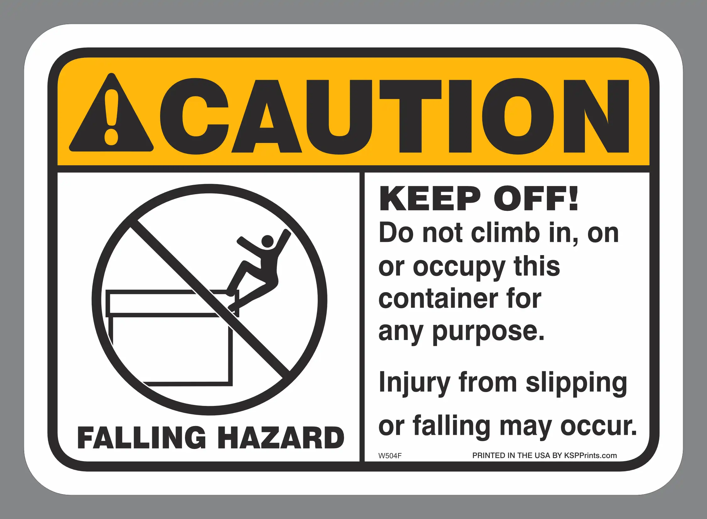 - Text: CAUTION FALLING HAZARD KEEP OFF! DO NOT CLIMB IN, ON, OR OCCUPY THIS CONTAINER FOR ANY PURPOSE. INJURY FROM SLIPPING OR FALLING MAY OCCUR.