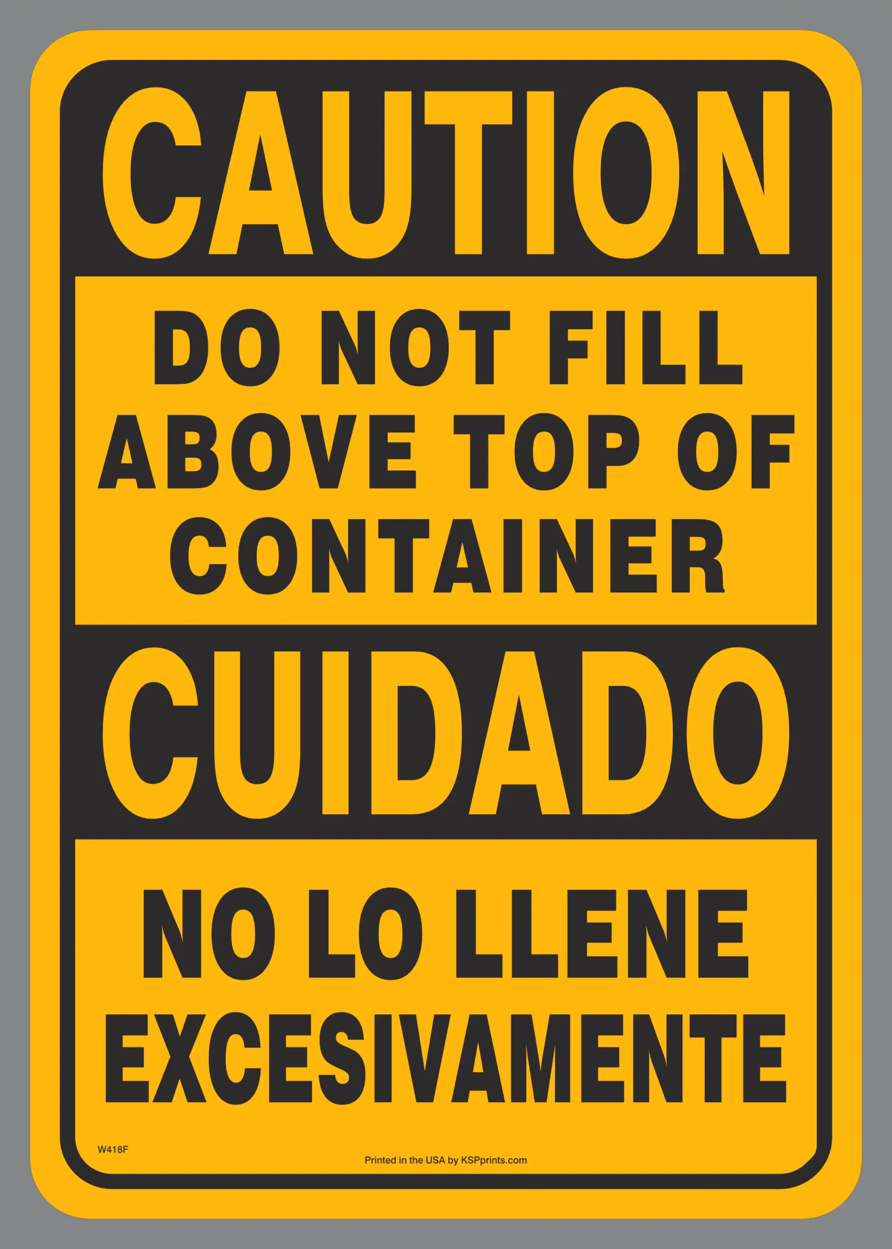 Because containers pose such a risk it is important that they can be read by all.  Hence our Bilingual Do Not Fill Above Sticker.  This bold do not fill sticker requests the attention of those near.  Making all aware of the hazard helps people avoid it and protects you from liabilities associated with it.