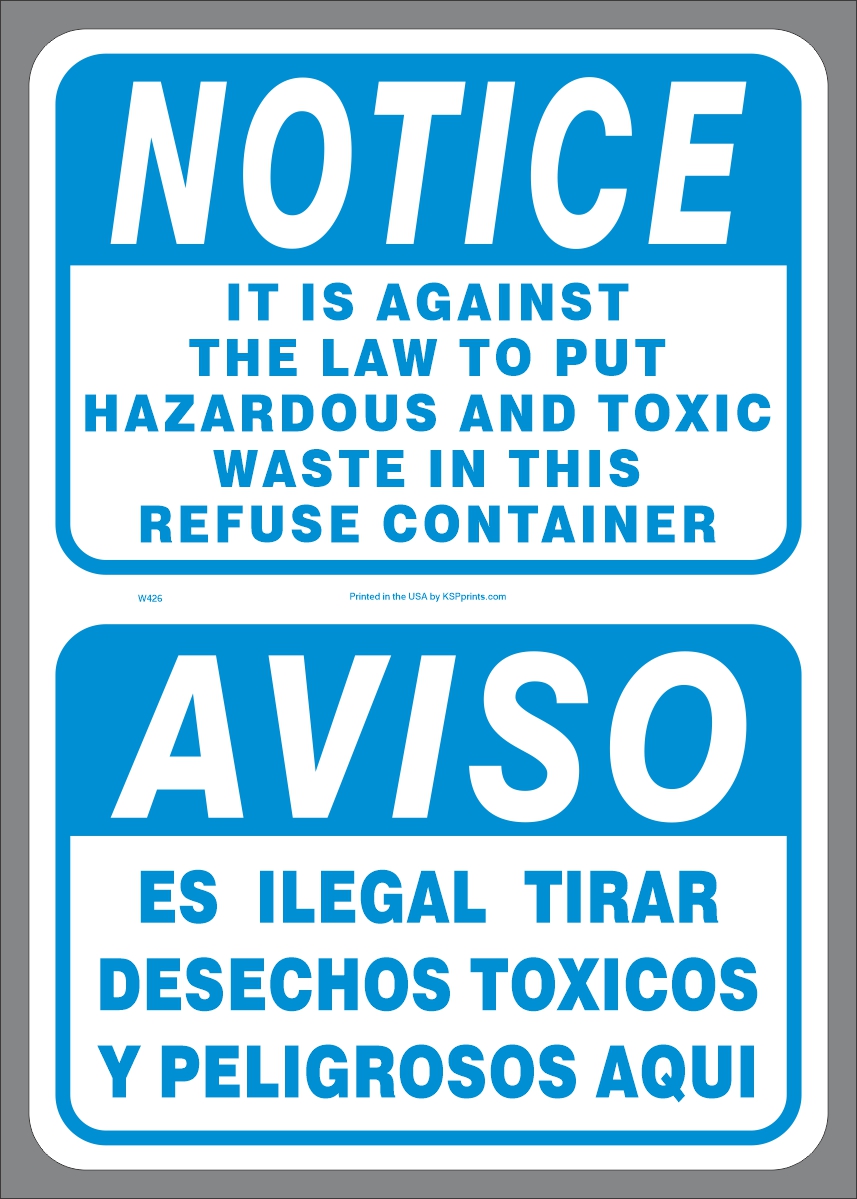 - Text: NOTICE IT IS AGAIN THE LAW TO PUT HAZARDOUS AND TOXIC WASTE IN THIS REFUSE CONTAINER AVISO IS ILEGAL TIRAR DESECHOS TOXICOS Y PELIGROSOS AQUI