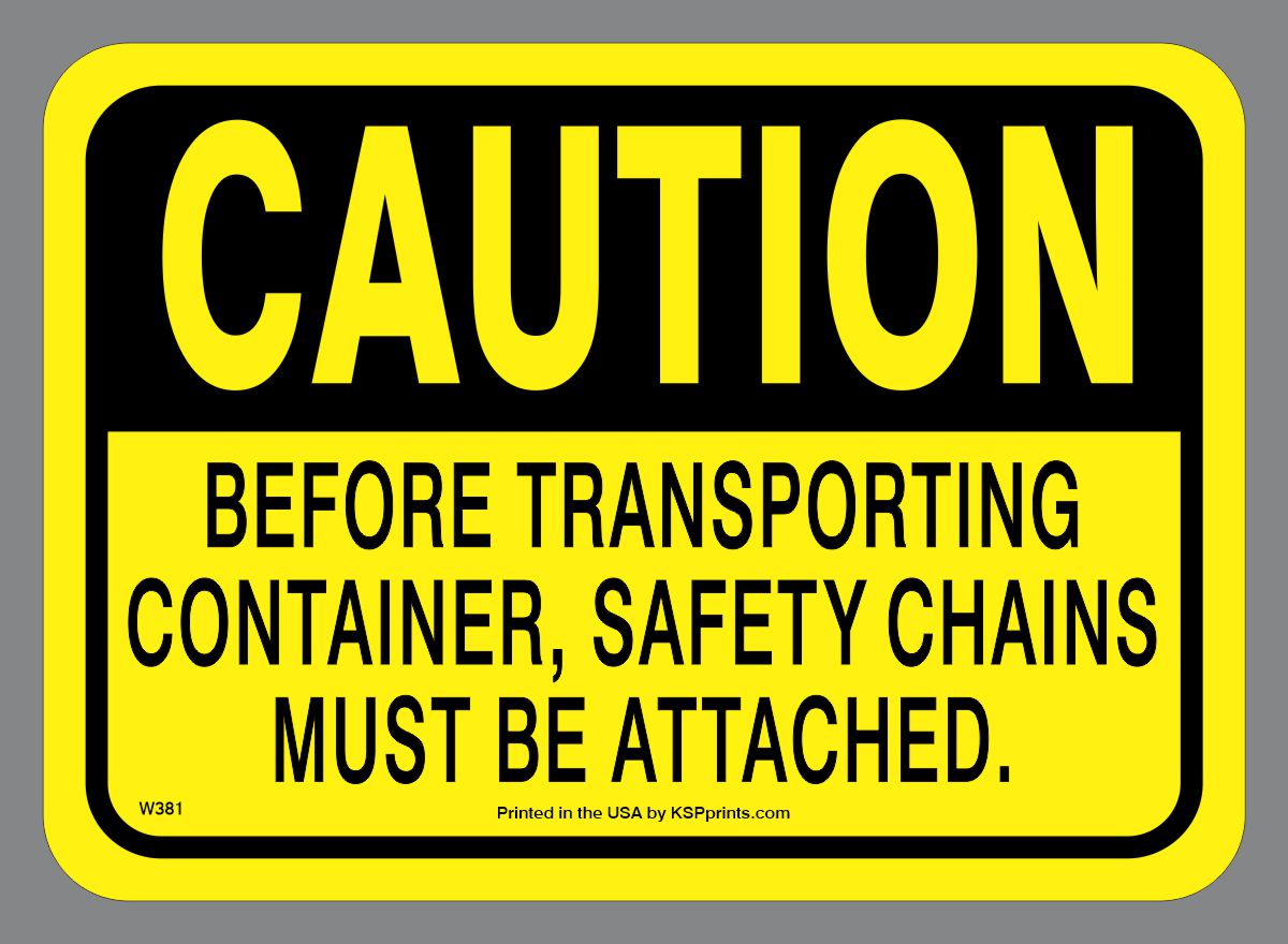 Because transporting containers can pose such a risk it is important that it can be read by all. Hence our container safety chains sticker. This bold before transport container decal requests the attention of those near. Making all aware of the hazard helps people avoid it and protects you from liabilities associated with it.