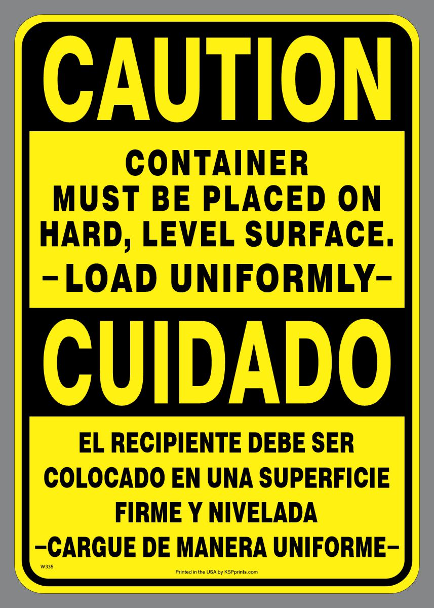 - Text: CAUTION CONTAINER MUST BE PLACED ON HARD, LEVEL SURFACE. -LOAD UNIFORMLY- CUIDADO EL RECIPIENTE DEBE SER COLOCADO EN UNA SUPERFICIE FIRME Y NIVELADA -CARGUE DE MANERA UNIFORME-