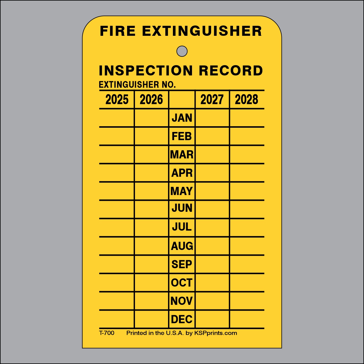 - Text: FIRE EXTINGUISHER INSPECTION RECORD, EXTINGUISHER NO., 2025,2026, 2027, 2028 with JAN, FEB, MAR, APR, MAY, JUN, JUL, AUG, SEP, OCT, NOV, DEC (running down middle column), T700 PRINTED in the USA by KSPprints.com.