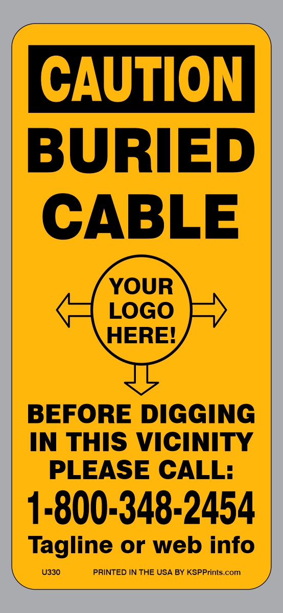 - Text: CAUTION BURIED CABLE (customized with your logo inside outward pointing arrows) BEFORE DIGGING IN THIS VICINITY PLEASE CALL: (customized phone number) (customized with one line tagline or website )