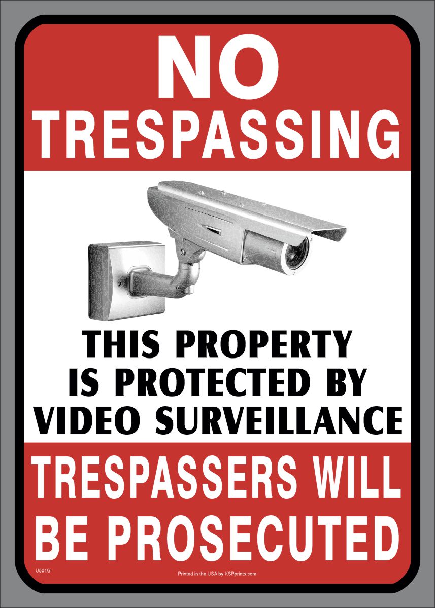 • Text: NO TRESPASSING THIS PROPERTY IS PROTECTED BY VIDEO SURVEILLANCE TRESPASSERS WILL BE PROSECUTED