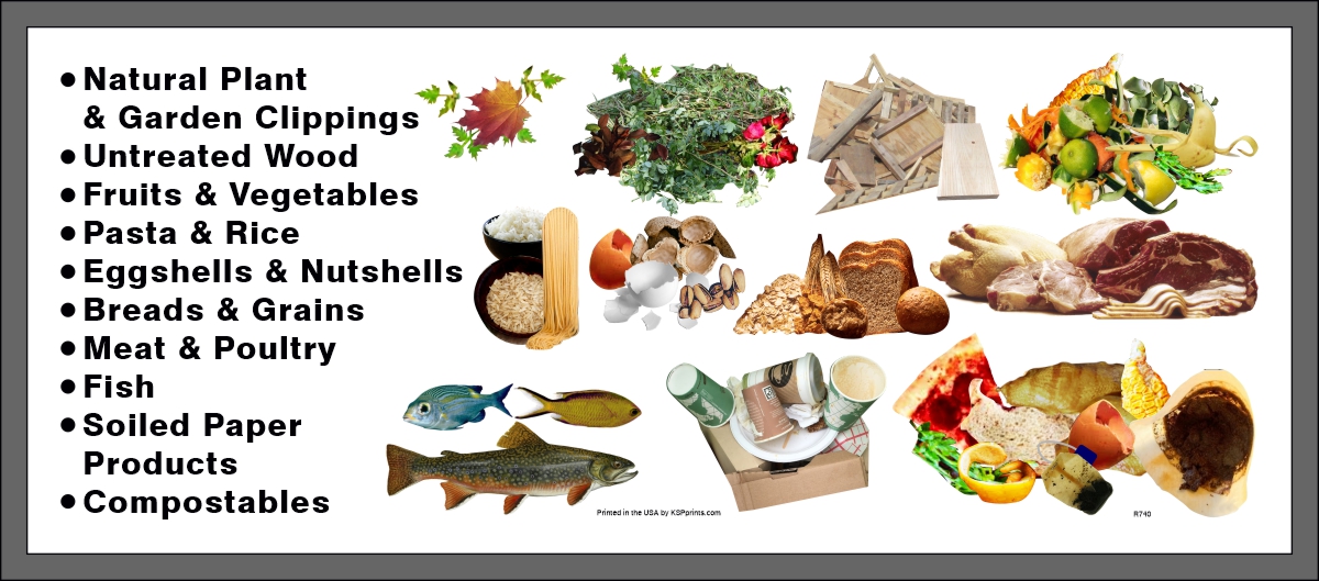 - Text: NATURAL PLANT & GARDEN CLIPPINGS, UNTREATED WOOD, FRUITS & VEGETABLES, PASTA & RICE, EGGSHELLS & NUTSHELLS, BREADS & GRAINS, MEAT & POULTRY, FISH, SOILED PAPER PRODUCTS, COMPOSTABLE