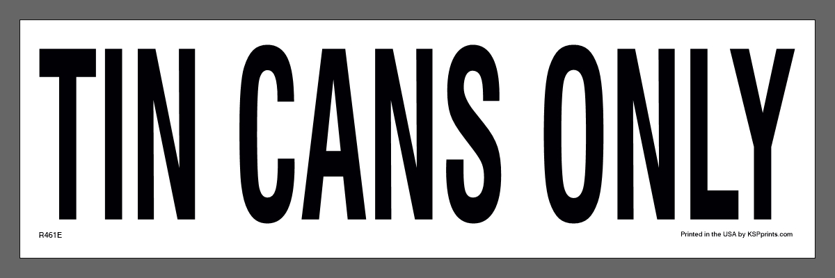 This tin can recycling sticker helps in the sorting of your waste stream management plan. When combined with recycle or recyclables only stickers you are telling your customers where to recycle. Specifically, that this is a tin cans only recycling container and to recycle only no trash. Printed on outdoor grade vinyl with hi-tack adhesives, like all of our container decals. In conclusion, this tin cans decal will withstand the elements and stay where you put them.
